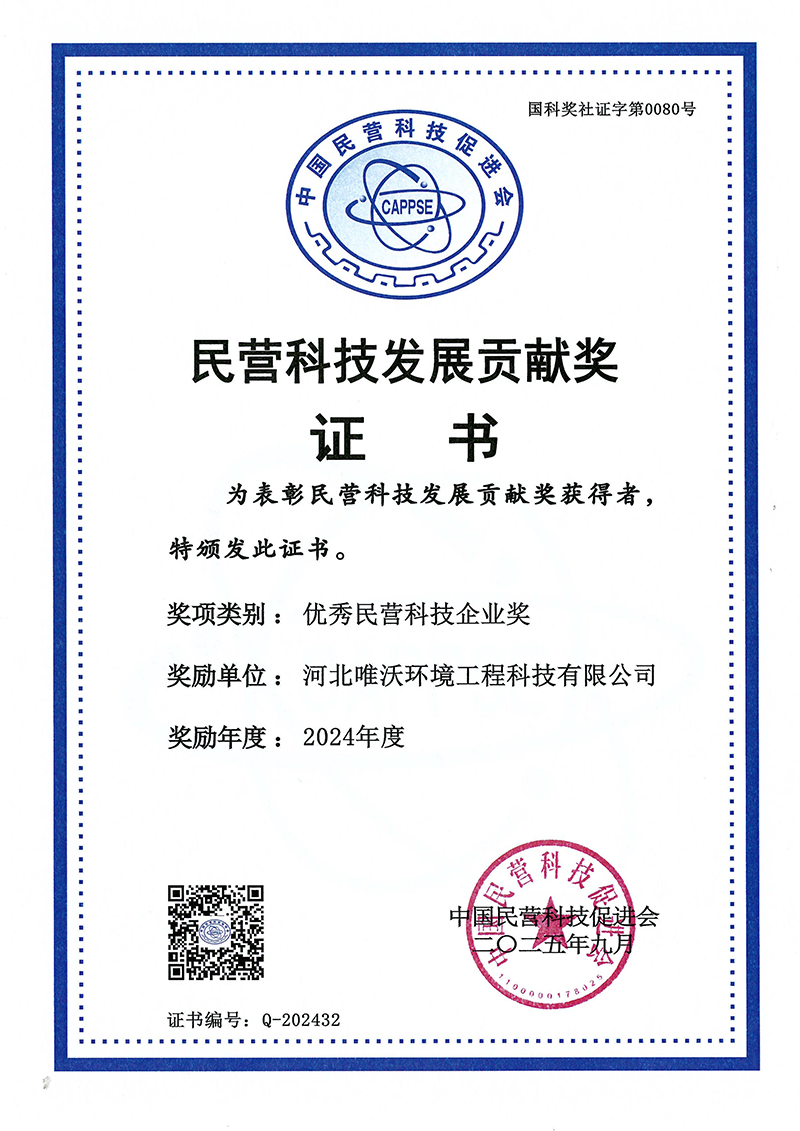 近日,河北唯沃环境工程科技有限公司(以下简称 “唯沃环境”)凭借在环境工程领域的科技创新实力与行业贡献,成功斩获 2024 年度 “优秀民营科技企业奖”。该奖项由中国民营科技促进会主办,经国家科学技术奖励工作办公室批准,是民营科技领域具有权威性的荣誉认证,彰显了行业对唯沃环境创新能力与发展成就的高度认可。